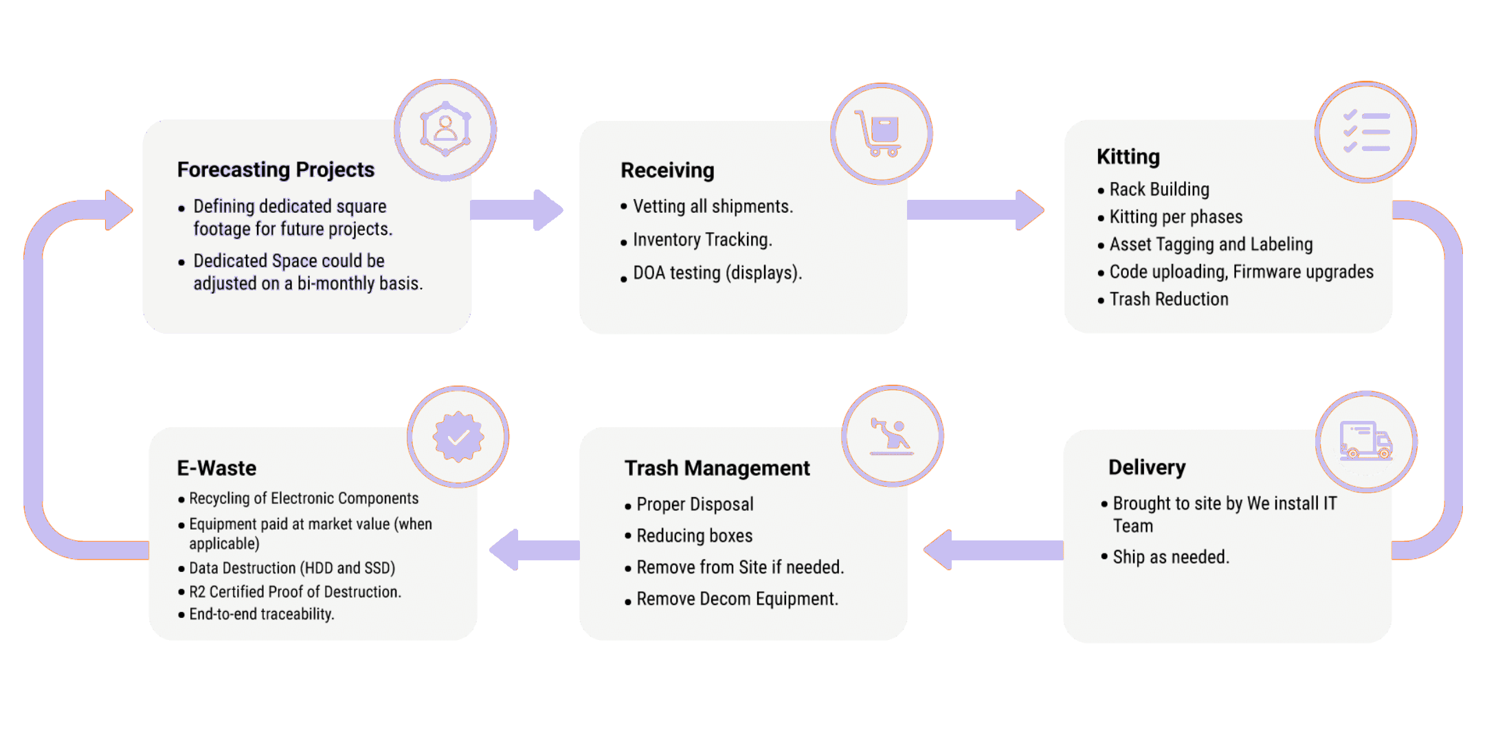 We have a warehouse in San Jose and one in Los Angeles —over 4000 square feet of space with the ability to expand it even further. Our staff will receive, DOA test, inventory, and pre-kit for our Field Teams to go to the site. We have our own vans to perform the site deliveries.